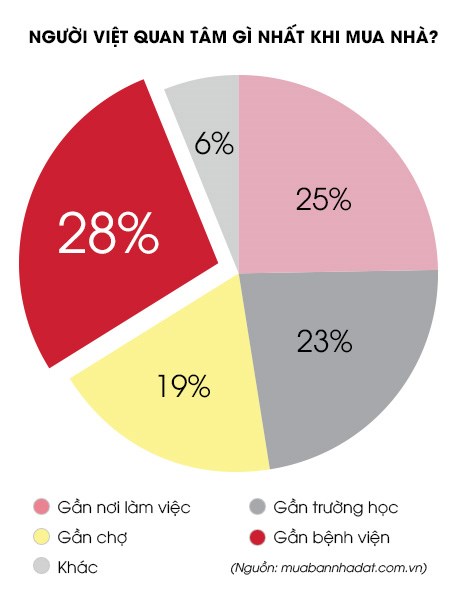 Theo đó, kết quả khảo sát cho thấy, sau yếu tố giá cả, thì yếu tố gần nơi làm việc đã được lựa chọn là quan trọng hàng đầu, chiếm tỷ lệ 28%. Tiếp theo là lựa chọn gần trường học với tỷ lệ 25%. Lựa chọn gần bệnh viện đứng thứ 3 với tỷ lệ 23%, tiếp đó là đến các tiện ích khác như gần bệnh viện, chợ, công viên, bến xe…
