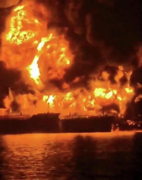 Một con tàu bốc cháy sau khi các tàu Iran chở đầy chất nổ tấn công hai tàu chở nhiên liệu trong vùng biển Iraq. © REUTERS Media Office of Iraqi Ports