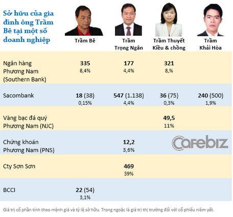 Tại Sacombank, ông Bê cùng 3 người con của mình đang trực tiếp sở hữu 81,2 triệu cổ phiếu, tương đương 6,8% lượng cổ phiếu đang lưu hành; với giá trị thị trường lên đến gần 1.800 tỷ đồng. Còn tại Ngân hàng Phương Nam, ông Bê và gia đình đang nắm giữ hơn 83 triệu cổ phiếu, tương đương 20,8% cổ phần. Con trai cả Trầm Trọng Ngân thay ông Bê giữ chức vụ Phó chủ tịch thường trực và con gái Trầm Thuyết Kiều giữ vị trí Phó tổng giám đốc.