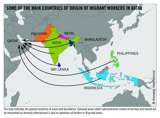 Qatar có tỷ lệ lao động nhập cư/dân địa phương cao nhất thế giới; khoảng 250,000 lao động nhập cư và chiếm 12% dân số. Phần lớn lực lượng lao động tại Qatar đến từ các quốc gia Nam Á. Họ thường phải trả hàng trăm hay nghìn đô cho các đại lý môi giới để tìm một công việc tại đây.
