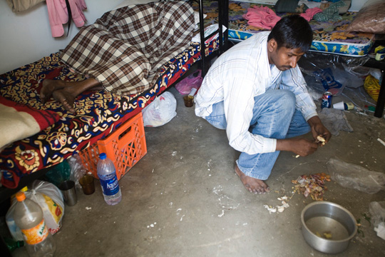 Mỗi ngày, sau khi tan làm, họ được những chuyến xe bus chở về khu trại này, trong bóng tối tĩnh mịch. Một vài người mặc áo khoác Neon, các bộ đồ bảo hộ; những người khác mang dáng vẻ của văn hóa quê nhà - người Bangladesh mặc những bộ Sarong, các công nhân Pakistan mặc Salwar-kameez... Sau bữa tối với 1 chiếc roti, ít cơm và rau luộc trong sảnh của khu trại, họ sẽ đi ngủ và dậy lúc 4h sáng. Một ngày như vậy lại cứ thế trôi qua.