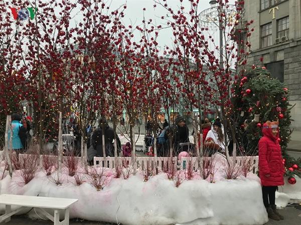 Những cổng vòm trang trí các cành thông và các quả cầu đỏ rực rỡ tạo không khí Giáng sinh thu hút mọi người chụp ảnh.