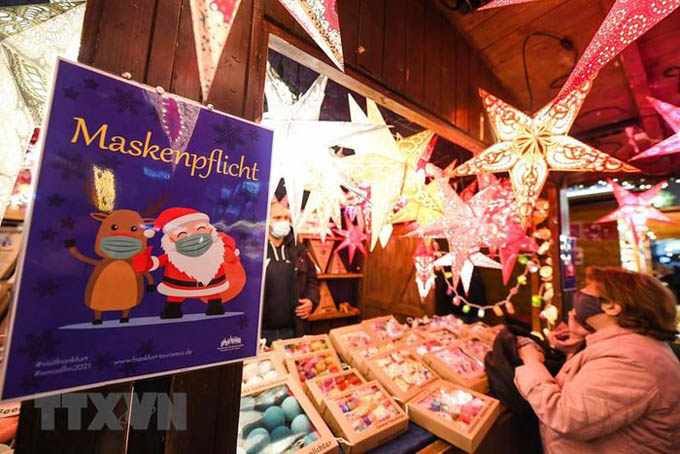 Bảng nhắc nhở người dân đeo khẩu trang phòng dịch COVID-19 tại Chợ Giáng sinh ở Frankfurt, Đức, ngày 22/11/2021. (Ảnh: THX/TTXVN)