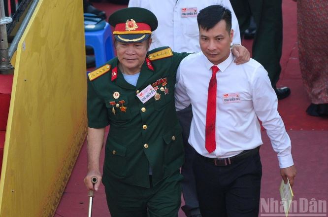 Đi lại khó khăn, một cựu chiến binh được dìu vào khán đài.