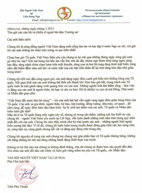 Thư của Hội người Việt nam tại Liên bang Nga gửi cán bộ , chiến sĩ quần đảo Trường Sa