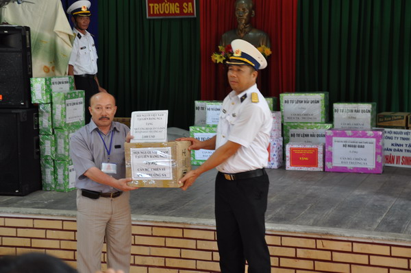 Đại diện Hội người VN tại Nga tặng quà và tiền (2000 USD) cho cán bộ chiến sĩ tại đảo Trường Sa Lớn.