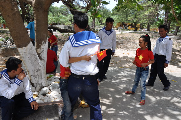 Đêm giao lưu văn nghệ giữa đoàn với chiến sỹ và nhân dân trên đảo thật là vui vẻ sôi nổi mà ấm cúng. Nhất là khi có sự xuất hiện của các em nhỏ 5 đến 9 tuổi ngây thơ trong bộ áo lính thủy trắng sọc xanh da trời cùng múa hát.
