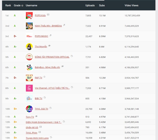 Bảng xếp thứ hạng các kênh YouTube hàng đầu của Social Blade tính đến 14/1/2021
