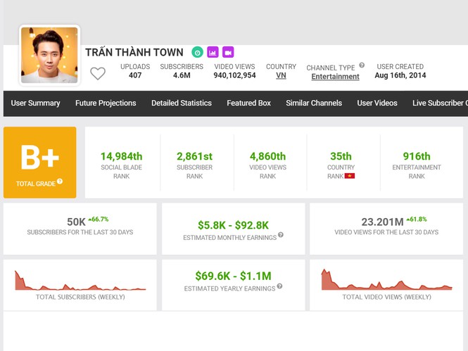 Kênh Trấn Thành Town hiện ước thu nhập từ hơn 1,6 - 25,3 tỷ đồng