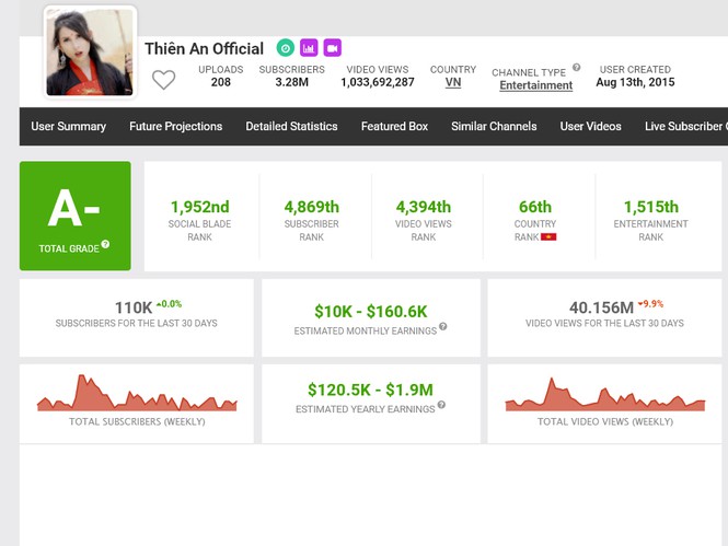 Đứng thứ 4 là “Thiên An Official” với hơn 3,28 triệu người đăng ký theo dõi và hơn 1 tỷ lượt xem toàn kênh. Social Blade ước tính trong vòng 1 năm kênh này có thể kiếm được 129.500 – 1,9 triệu USD, tương đương từ 3 – 44 tỷ đồng.