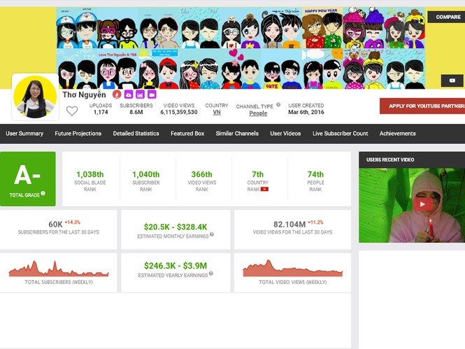 Kênh YouTube Thơ Nguyễn hiện đạt hơn 6,1 tỷ lượt xem