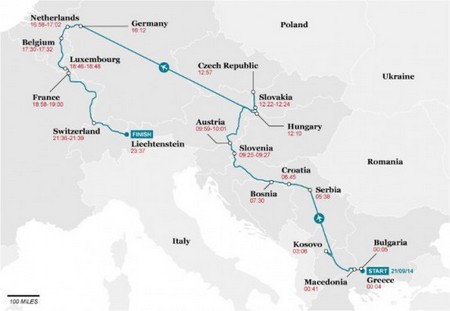 Từ đó 3 người này đã đi qua 18 quốc gia khác nhau, bao gồm Bulgaria, Macedonia, Kosovo, Serbia, Croatia, Bosnia, Slovenia, Áo, Hungary, Slovakia, Cộng hòa Séc, Đức, Hà Lan, Bỉ, Luxembourg, Pháp và Thụy Sĩ. Điểm đến cuối cùng của hành trình là Liechtenstein trước thời hạn 24 giờ kết thúc.