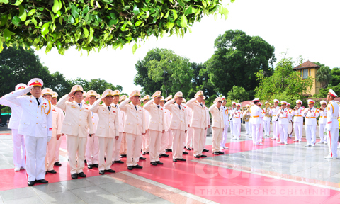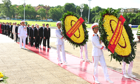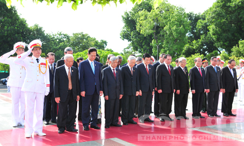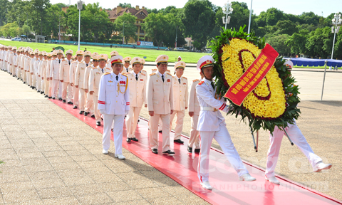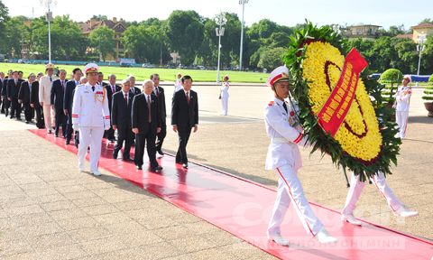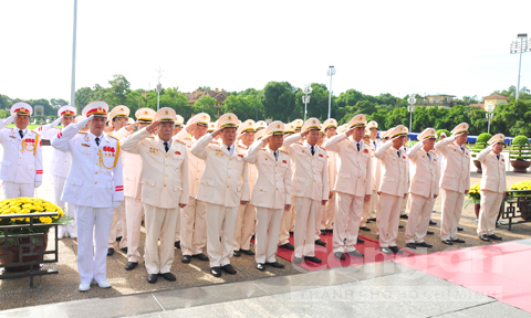 Lãnh đạo Đảng, Nhà nước vào Lăng viếng Chủ tịch Hồ Chí Minh nhân dịp kỷ niệm 70 năm Ngày Truyền thống CAND (19/8-/945-19/8/2015) và 10 Năm Ngày hội toàn dân bảo vệ ANTQ (19/8/2005-19/8/2015) (Ảnh: Quốc Huy):