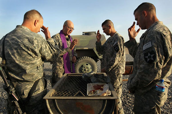 Quân đội Mỹ cũng có cha tuyên úy, đây là những người được đào tạo trong các trường dòng và sau đó được quân đội thu nạp, huấn luyện kỹ năng sinh tồn để đưa ra chiến trường làm nhiệm vụ cầu nguyện cho binh lính. Ảnh: Archive.