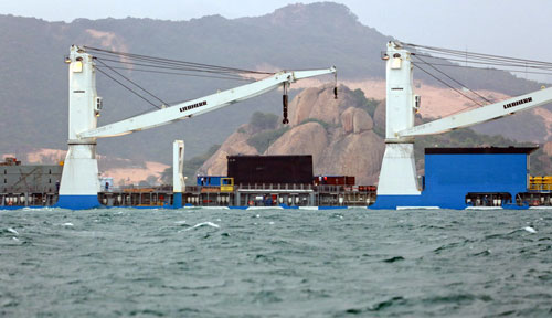 Tàu vận tải Rolldock Star đang được bơm nước vào để tàu ngầm kilo tiếp nước, rời tàu mẹ -