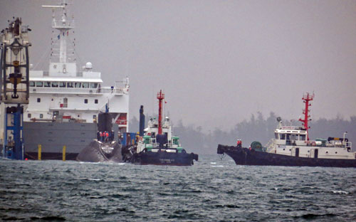 Cũng khoảng 8g sáng, hai tàu lai dắt hệ Azimuth của Quân chủng Hải quân đã có mặt để đảm nhận công việc quan trọng đưa tàu ngầm vào quân cảng. Một xuồng CQ cũng có mặt để làm nhiệm vụ bảo vệ quanh khu vực tàu ngầm, xua các tàu cá, tàu không có phận sự vào khu vực lai dắt.