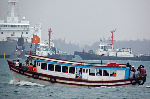 Một tàu du lịch đi qua khu vực lai dắt tàu ngầm kilo vào quân cảng Cam Ranh - Ảnh: Tiến Thành