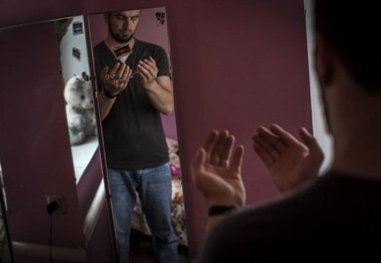 Ahmed, một thanh niên làng Novosasitli từng tới Syria tham chiến trong vài tháng đang cầu nguyện trước gương tại nhà. Ảnh Dmitri Beliakov/Washington Post