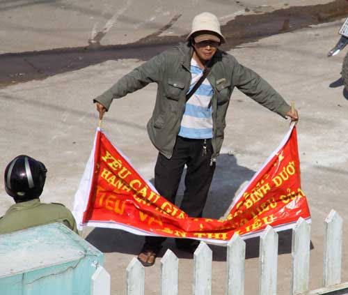 Căng băng rôn và các khẩu hiệu trước nhà bà Hạnh - Ảnh: Đỗ Trường