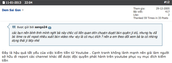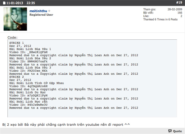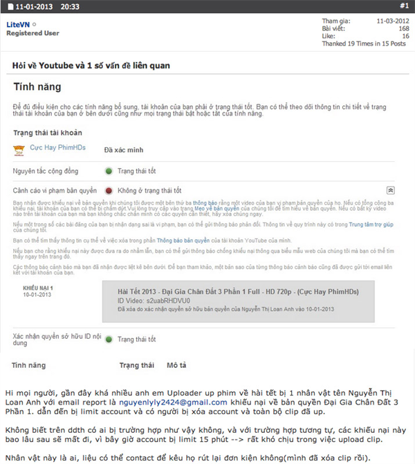 Theo như thành viên này, rất nhiều phim hài tết đều bị một nhân vật tên Nguyễn Thị Loan Anh với email nguyenlyly2424@gmail.com khiếu nại vấn đề bản quyền dẫn tới bị giới hạn và xoá account cũng như toàn bộ clip đã tải lên trước đó. Ngay sau khi chủ đề được đưa ra, có rất nhiều thành viên đã xác nhận gặp tình trạng tương tự.