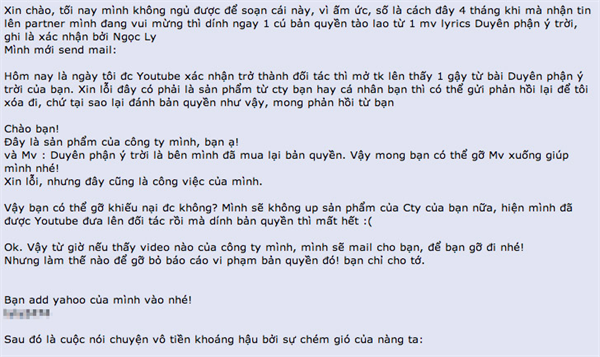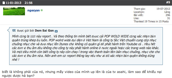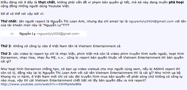 Điểm đáng nghi được đưa ra "mổ xẻ" ở đây là người report lấy tên Nguyễn Thị Loan Anh trong khi tài khoản email dùng để report có tên Nguyễn Ly. Công ty nắm giữ tất cả bản quyền của số video bị report mà nhân vật này đưa ra có tên Vietnam Entertaiment, tuy nhiên trên thực tế không có công ty nào với tên này ở Việt Nam.