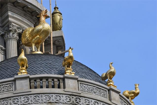 Điểm đặc biệt của tòa nhà này là được gắn 6 con gà và một số đồ trang trí trên nóc. Tất cả đều được dát vàng.