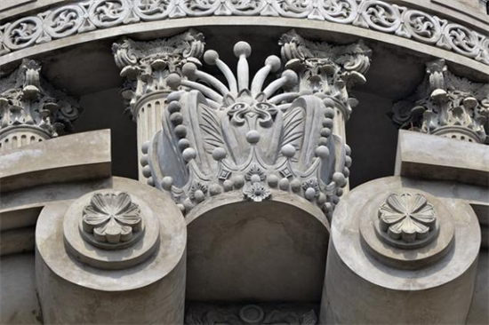Hai cửa sổ tầng 4 được trang trí những họa tiết tinh xảo, đều được dát vàng