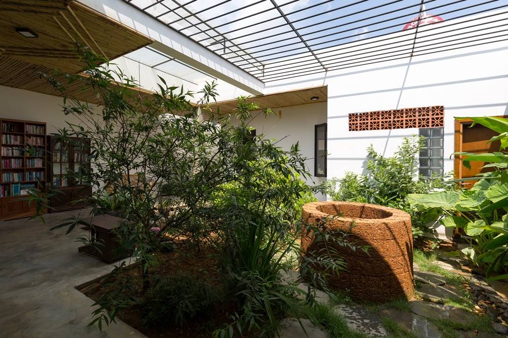 Khoảng sân nối hai gian nhà đẹp giản dị với giếng nước, giếng trời và từng bụi cây xanh đầy sức sống