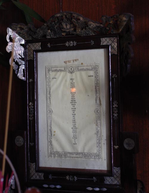 Bàn thờ với bài vị thờ những chiến sĩ hi sinh vì chiến tranh, thuyền nhân, người tha hương xa gần... trong chùa ở đảo Song Tử Tây. Bài vị ghi “Cung thỉnh: Phục vì trận vong chiến sĩ chiến tranh nạn dân thất mệnh thuyền nhân vô danh liệt sĩ nam nữ vô chủ viễn cận tha hương nhất thiết oan hồn uổng tử vị tiền” (tạm dịch nghĩa: Bài vị thờ những chiến sĩ chết trận, người dân gặp nạn trong chiến tranh, những thuyền nhân mất mạng, các liệt sĩ không tên tuổi, những người trai gái không rõ gia đình, người gần xa bỏ quê, tất cả các người chết oan uổng) - Ảnh: Q.Hiếu