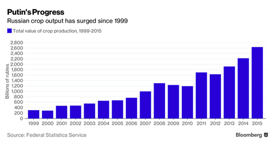 Đối mặt với giá dầu giảm, đồng ruble mất giá, các lệnh cấm vận tài chính từ phương Tây và cuộc suy thoái dài nhất trong 16 năm cầm quyền, ông Putin, 63 tuổi, đang cố gắng giảm thiểu sự phụ thuộc của Nga vào các thị trường mà ông không thể kiểm soát. Những lệnh cấm vận áp đặt vào ngành nhập khẩu lương thực cũng như việc gia tăng các khoản hỗ trợ lớn từ chính phủ khiến rất nhiều ngành nông nghiệp của Nga có lợi hơn là bị tổn thương. Ông Putin đã gọi nông nghiệp Nga thời kỳ này là một “con ngỗng vàng”. Giá cả thực phẩm cũng tăng lên cùng với lạm phát, gần gấp đôi với mục tiêu 4% của ngân hàng trung ương, khiến tiền đi từ túi những người tiêu dùng sang các nhà sản xuất có định hướng tốt.