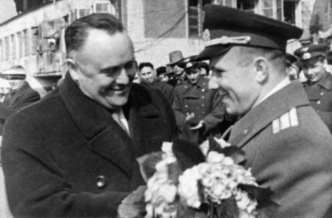 Nhà khoa học Xô viết, viện sĩ, “cha đẻ” ngành hàng không vũ trụ Sergei Pavlovich Korolyov (bên trái) chúc mừng phi hành gia đầu tiên của nhân loại Yuri Gagarin sau chuyến bay vũ trụ lịch sử thành công. © Sputnik