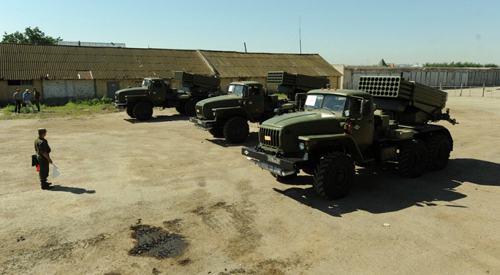 Tổ hợp pháo phản lực bắn loạt tự hành BM-27 Uragan được trang bị đạn cỡ 220mm.