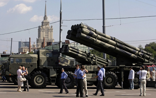 Hệ thống pháo phản lực đa nòng Smerch và Uragan được trưng bày tại triển lãm vũ khí quốc tế Moskva năm 2008.
