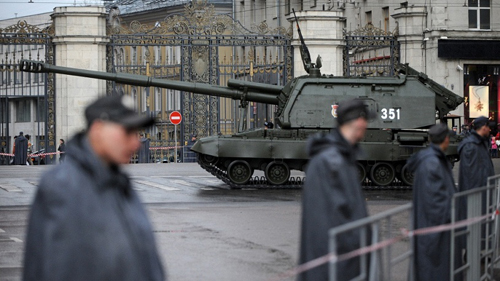 Hệ thống pháo tự hành Msta-S lừng lững trên khung xe, chuẩn bị cho cuộc tổng duyệt diễu binh Ngày chiến thắng năm 2011.