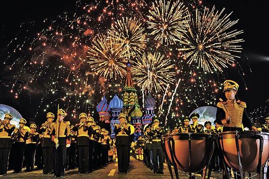 Các đêm trình diễn trong Liên hoan quân nhạc quốc tế  "Tháp Spasska" luôn rực rỡ với các show laser và các màn pháo hoa.