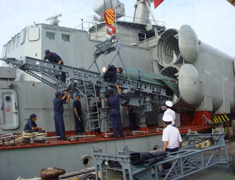 Các kỹ thuật viên Hải quân Việt Nam đang nạp đạn tên lửa P-20M vào bệ phóng KT-138.