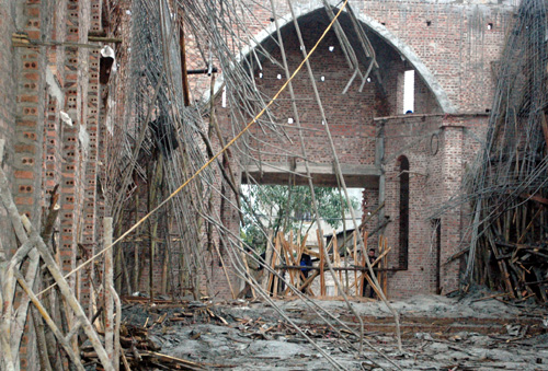 Nhiều cây chống nhỏ được ghép để đỡ cốt pha. Nhiều máy trộn bê tông loại nhỏ được sử dụng cho công trình này. Được biết đây là công trình do người dân tự nguyện đóng góp công sức xây dựng bằng ngày công. Những người tham gia xây dựng chủ yếu là bà con giáo dân ở các xóm Ngọc Lâm, Bến Đò, Xóm Dưới thuộc xã Linh Sơn.