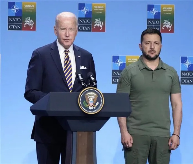 Tổng thống Mỹ Joe Biden (trái) và Tổng thống Ukraine Volodymyr Zelensky tại Hội nghị thượng đỉnh NATO ở Vilnius, Litva. Ảnh: Kyodo/TTXVN