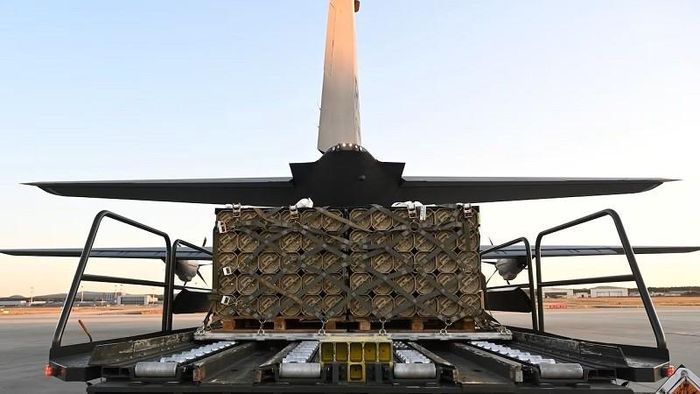 Lô đạn dược được chất lên chiếc C130-J Super Hercules từ Đội không vận số 86 tại căn cứ không quân Ramstein của Mỹ ở Đức để chuyển cho Ukraine.