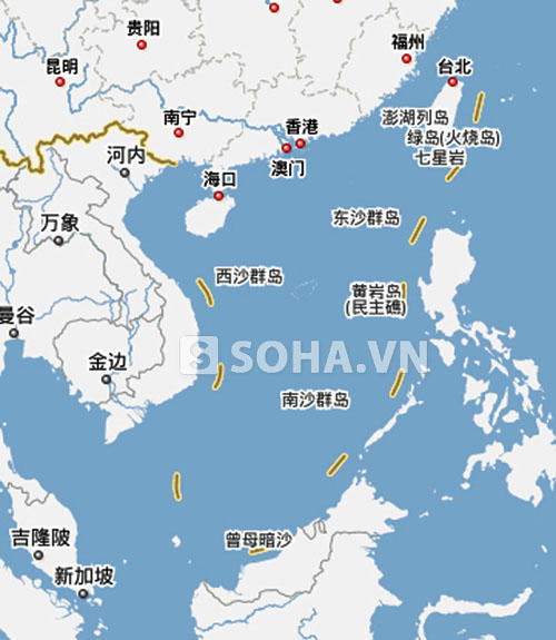 Trong khi đó, bản đồ Biển Đông bằng tiếng Trung lại thể hiện rất rõ "đường lưỡi bò" phi pháp mà phía Trung Quốc đã tự "vẽ" ra để lấy cớ tranh chấp.
