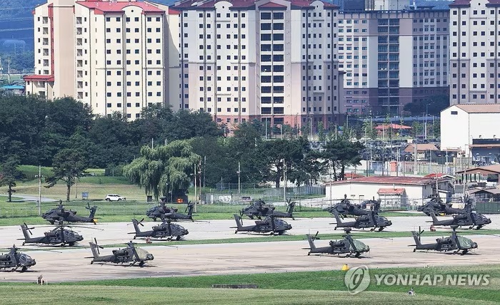 Trực thăng quân sự đỗ ngoài trời tại căn cứ quân sự Humphreys ở Pyeongtaek, cách Seoul khoảng 60 km. Ảnh: Yonhap.