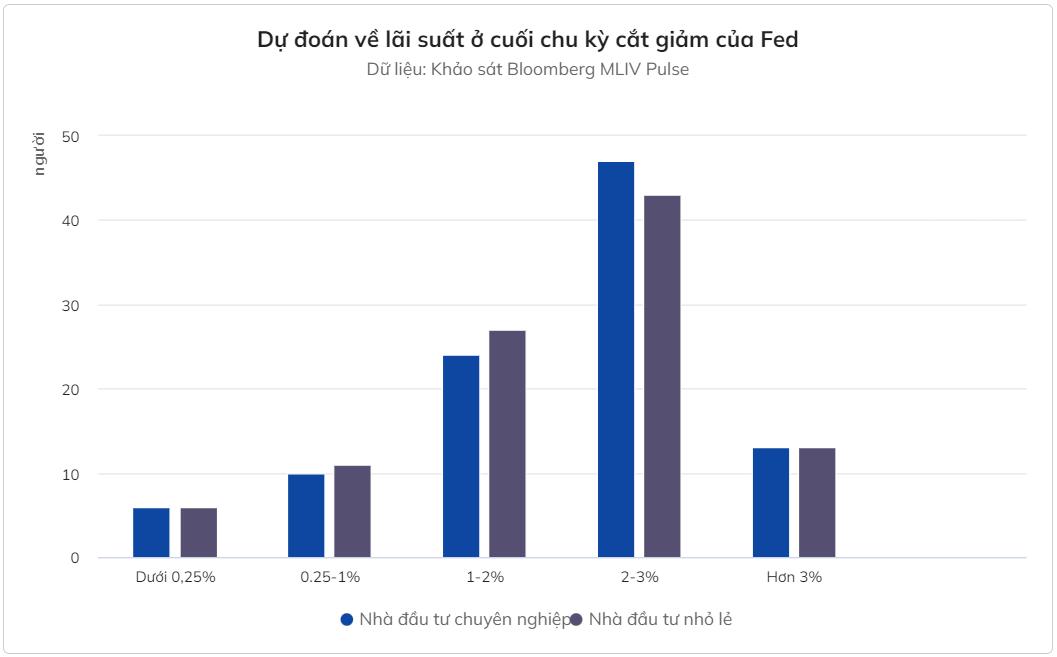 Theo khảo sát mới nhất của MLIV Pulse, khoảng 87% trong số 331 người được hỏi tin rằng Fed sẽ cắt giảm lãi suất xuống 3% hoặc thấp hơn. 40% dự báo chu kỳ nới lỏng của ngân hàng trung ương Mỹ bắt đầu trong năm nay, cao hơn những gì đang được thể hiện trên thị giá.