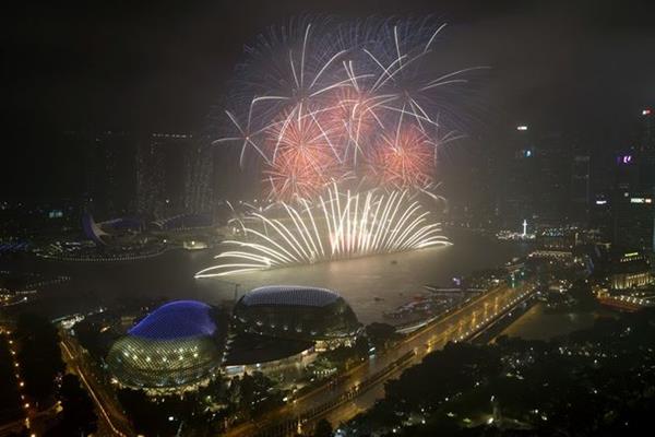 Pháo hoa rực sáng bên nhà hát Esplanade, hay còn gọi là nhà hát Sầu riêng. Ảnh: AFP