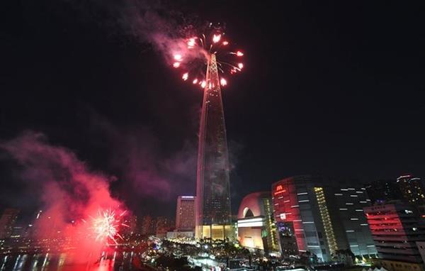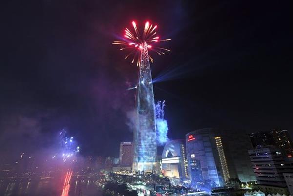 Tại Hàn Quốc, năm mới 2018 được chào đón bằng màn pháo hoa hoành tráng trên nóc tòa nhà Lotte World Tower 123 tầng, cao 555 m ở thủ đô Seoul. Ảnh: AFP