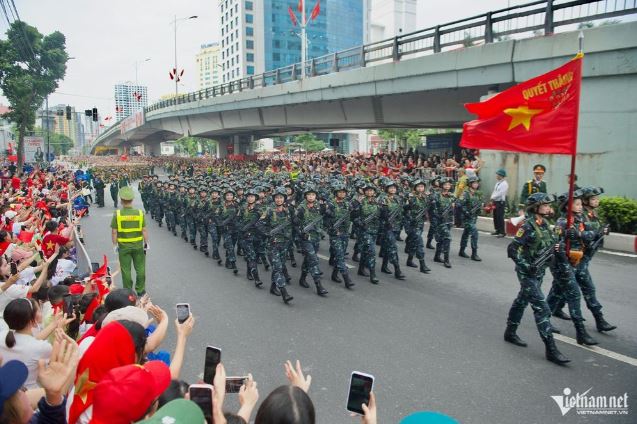 Đoạn giao giữa phố Nguyễn Thái Học và Điện Biên Phủ là một trong số ít địa điểm xem được nhiều khối nhất và thu hút lượng người dân khá lớn. Trong ảnh là khối chiến sĩ Công binh.