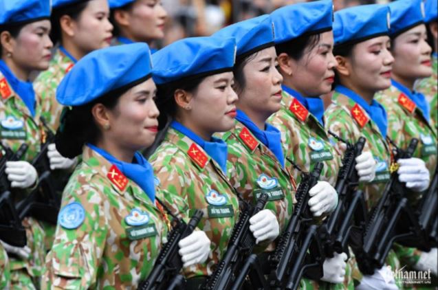 Trong số đoàn quân tiến về quảng trường Cách mạng Tháng Tám có khối nữ sĩ quan Gìn giữ hòa bình. Đây là biểu tượng của sự hội nhập quốc tế, hòa bình, nhân văn, tô điểm thêm nét đẹp trí tuệ, bản lĩnh trong đội hình trang nghiêm, thể hiện sự đóng góp của phụ nữ Việt Nam không chỉ trong nước mà còn trên trường quốc tế. Ảnh: Thạch Thảo.