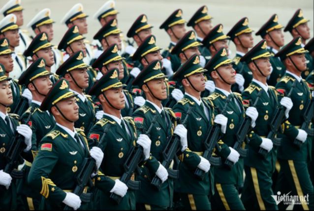 Nhiều người dân hai bên đường đã tập trung từ 12h trưa, thậm chí có người đến từ 6h sáng 29/8 để chờ đợi xem được khoảnh khắc hùng dũng này. Trong ảnh, đoàn Quân Giải phóng Nhân dân Trung Quốc đi qua ngã 7 Cửa Nam. Ảnh: Giang Trịnh.