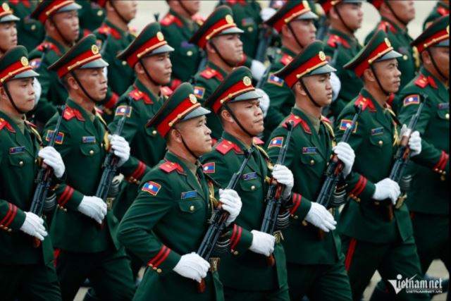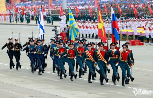 Đặc biệt, trong buổi tổng duyệt sáng 30/8 có sự góp mặt của đầy đủ 4 đơn vị Quân đội đại diện cho 4 quốc gia: 120 quân nhân đoàn Quân Giải phóng Nhân dân Trung Quốc; khối Quốc kỳ Liên bang Nga - hộ tống là đội danh dự đại diện cho 3 Quân chủng của các Lực lượng Vũ trang Liên bang Nga là Lục quân, Không quân - Vũ trụ và Hải quân; khối Quân đội Nhân dân Lào - là lực lượng vũ trang chủ lực của cách mạng dân tộc Lào; khối Quân đội Hoàng Gia Campuchia. Ảnh: Phạm Hải.