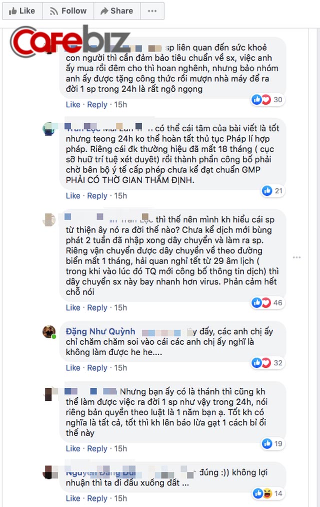 - Anh Đặng Như Quỳnh: Có thể mọi người đọc, nhưng không để ý kỹ thông tin chi tiết ở trong bài. Ngay khi bắt đầu vào chiến dịch sản xuất khẩu trang, thì kế hoạch sản xuất tiếp theo của chúng tôi là cồn sát khuẩn khô. Trong bài, tôi có nêu rõ là khi tôi đăng thông tin cần làm sản phẩm đó, thì có 1 nhóm chuyên gia bên dược – tôi không tiện nêu tên, nhưng sẽ chú thích rõ về sau tên của nhóm chuyên gia này, giúp đỡ.