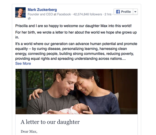 "Mẹ con và cha vẫn chưa có lời nào để diễn tả niềm hy vọng về con mai sau", Mark Zuckerberg, 31 tuổi, và vợ Priscilla Chan, 30 tuổi, mở đầu bức thư gửi con gái mới chào đời. Nội dung thư được tạo bằng công cụ ghi chú (Notes) với rất nhiều tâm tư, tình cảm từ ông chủ Facebook.